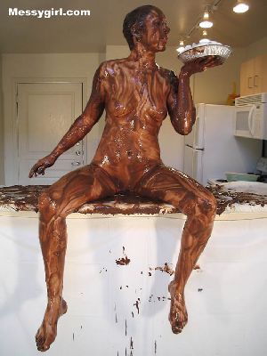 Liz is dressed as a sexy chef and makes a total mess of herself in batter, pies, chocolate and a sheet cake that she sits on!