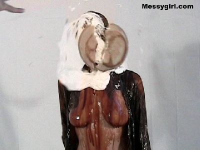 Allison is in her corset, garters, stockings and heels as she is covered in pies, slime and chocolate batter. She goes topless for the first time!