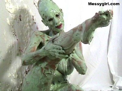 Nikki is in a sexy tight dress, garters, stockings and heels before she does her self wamming with pies, chocolate batter, melted ice cream and green slime. Clothed to nude and so very sexy!