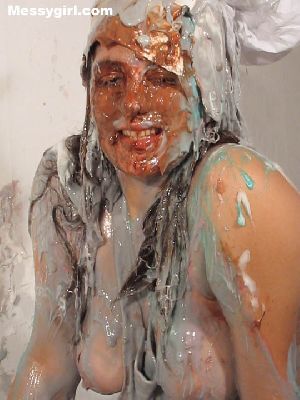 Liz gets artsy, as she is covered head to toe in gold paint. The transformation is breath taking as she is turned into a sexy living work of art. Then is defaced with a bucket of slime, but not to worry, it adds to the transformation into a living work of art, messygirl style.
