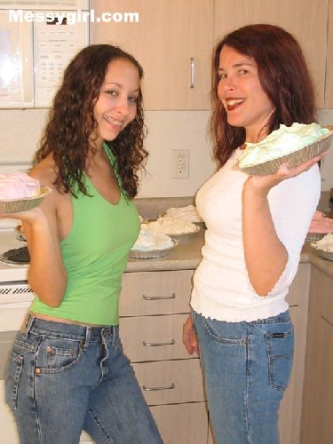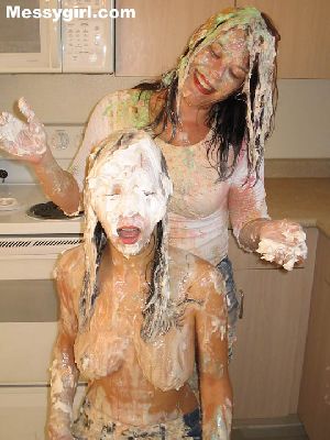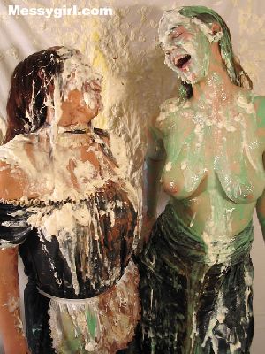Lexi and Linda fill each others jeans and tops with shaving cream using a long hose attachment. They then finish each other off with real cream pies to the face.
