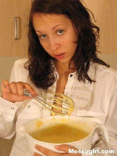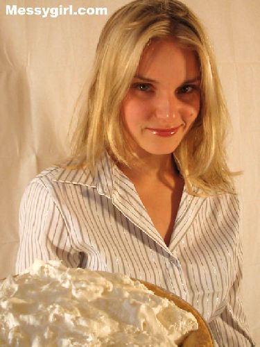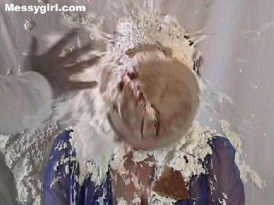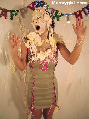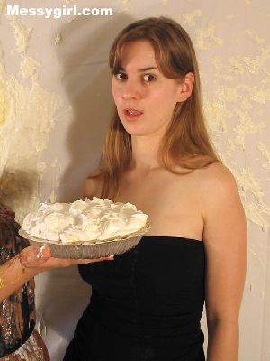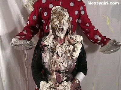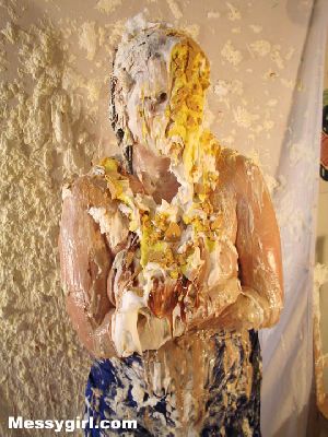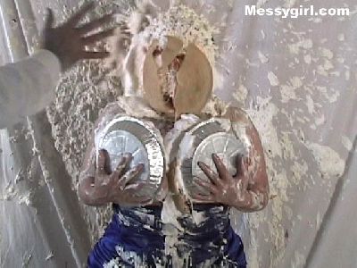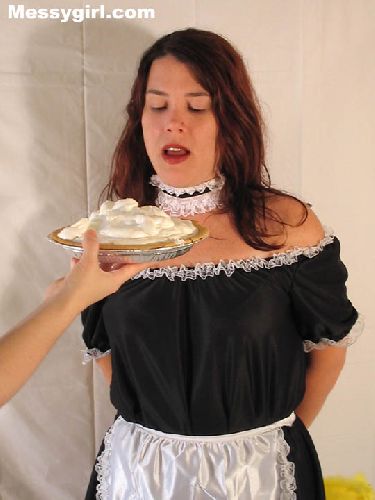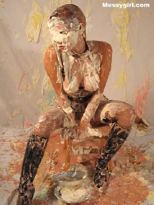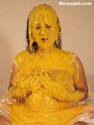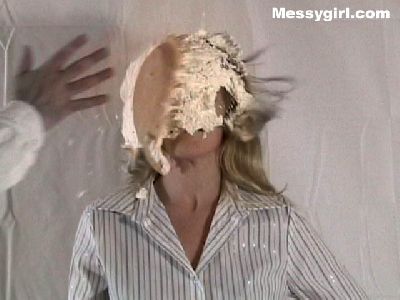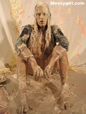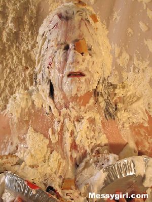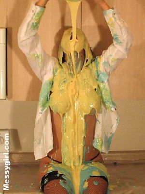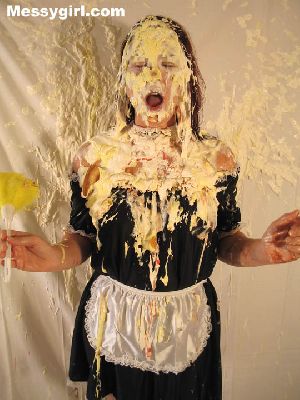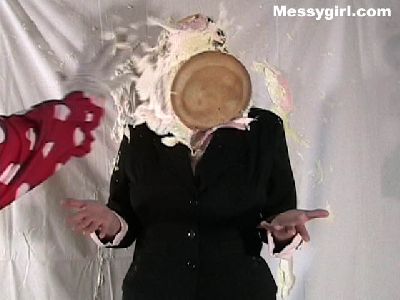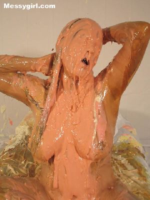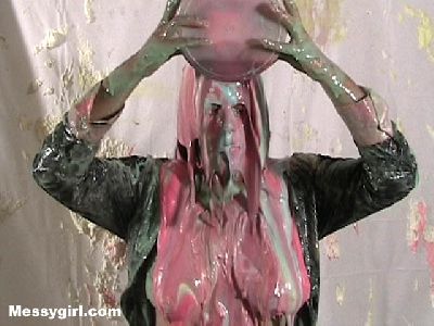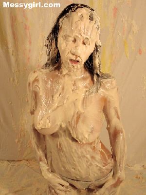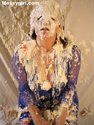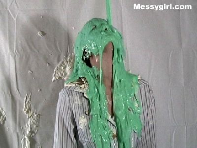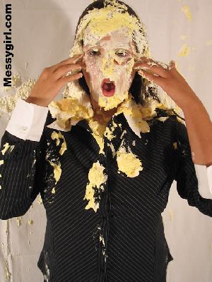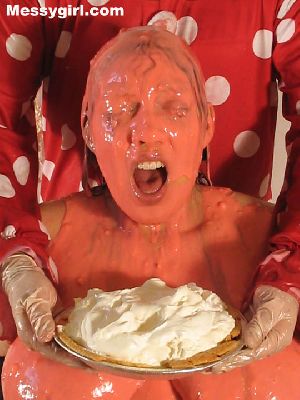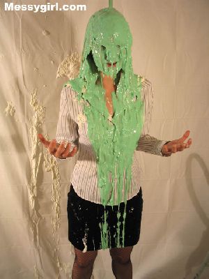 Liz is pied and slimed messygirl style in her very first shoot for us. She starts out in a silk blouse and black skirt and before you know it she is nude and covered head to toe in the slop!
