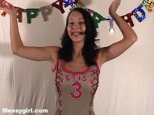 Cute and sexy Katie wakes up to a messy pie, slime and pudding onslaught. She is covered head to toe! She then starts to enjoy the mess and rubs it all over her nude body. She even straddles her messy pillow!