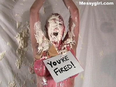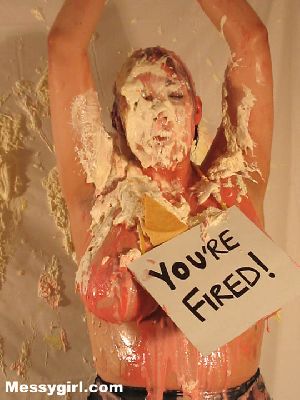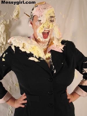 Katie does her first messy shoot for us in business attire. She is blasted with pies and coated with slime and melted ice cream. She finishes herself off with a pie between her legs!