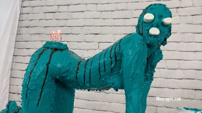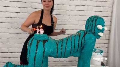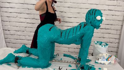 Dakota wants to celebrate her 19th birthday in style. So we arrange to have her made into a human birthday cake with Penelope on hand to prepare it. Dakota is stripped nude and put in the bondage shackles while on all fours. She is then covered head to toe in buttercream frosting and other decorative treats.
