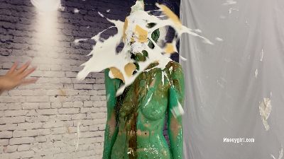 Busty Megan has all kinds of sweet and savory messy foods poured over her. She then has the gross slop mixed poured over her again.