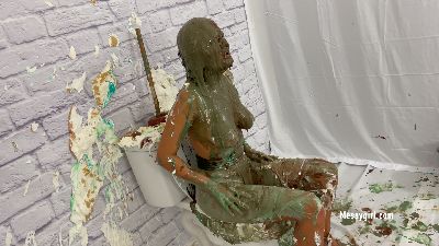 19 year old newbie Cassandra is humiliated and destroyed with pies and slime as she sits on a toilet.