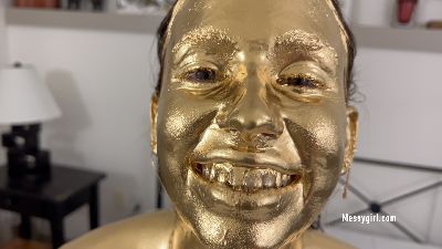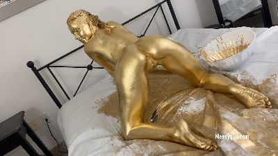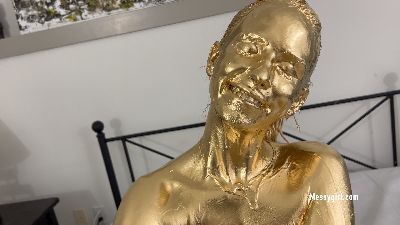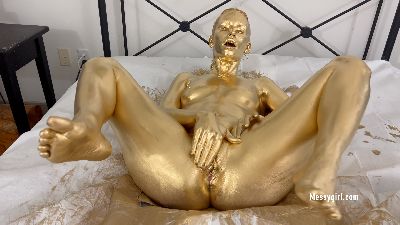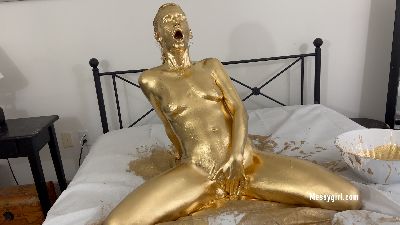 Adorable 19 year old Dakota does her first gold paint shoot. She is more than happy to show off every inch of her body as she covers herself. The paint collects in a pool underneath her and eventually goes inside her pussy and asshole, causing wet queef noises. Hot stuff!