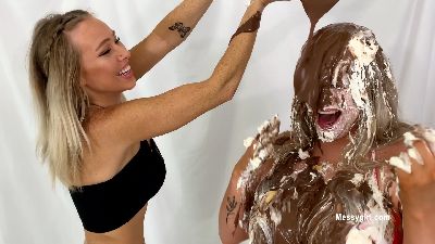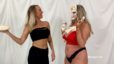 Priscilla meets Penelope for the first time. They are well dressed in the dessert line and Priscilla is taking too much time to decide what she wants. Penelope becomes annoyed and pushes Priscilla to hurry up. Well, this sets off a classic tit for tat messy fights between them. Both girls go at it hard and messy with pies to the face, batter pours and face dunks. Lots of hair pulling too.