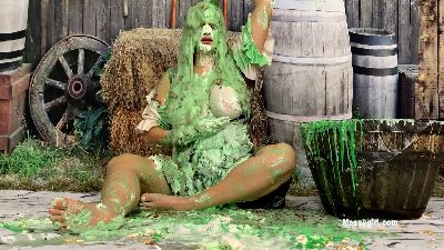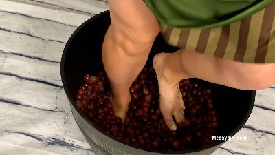 Busty Alice is in a sexy peasants dress as she stomps in a barrel of grapes. While stomping, the pies come at her. Then her top is pulled down exposing her huge tits. She is also slimed and covered in the grape slop.