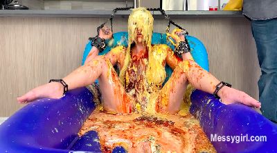 Zoey takes her turn as the Human Garbage Disposal. She is destroyed with all kinds of savory slop. We also turn her upside down for a sloppy pussy pouring.