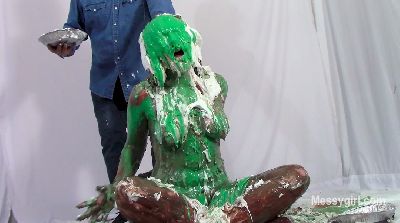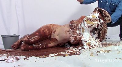 Penelope is in a sexy black vinyl dress and ankle boots. She gets on the floor and finds two catering size buckets of Nutella. She slowly starts to cover her dress and boots in the sweet stuff. You get a nice view of her ass and pussy as she does this. She then strips off the dress and continues the coverage on her nude body. She gets more into it and gives her face some very nice coverage. She is now unrecognizable. You get a nice view as she shows off every inch of her now Nutella slathered body. Very hot total coverage.
