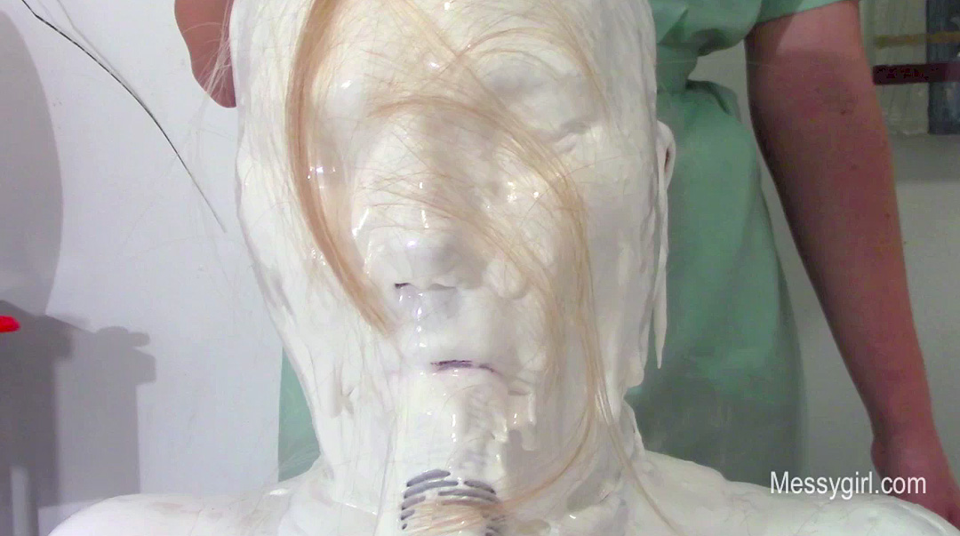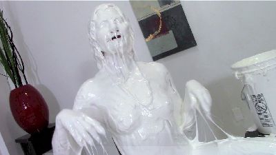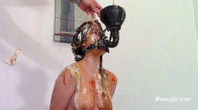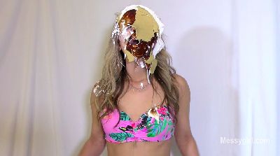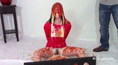 Amy is selling the Messy Boat 2000 and demonstrates all the features. As she talks about the features, she is pied and slimed non stop. During her messy onslaught, the slop starts to collect in the seating area around her. The receptacle at the end of the boat starts to fill up from the slop. Once filled, she proceeds to dunk her head in it. She then spread her legs and places her feet into the built in stirrups for more over the head pours. You get a nice view of her exposed pussy as the slop pours over her face and between her legs.