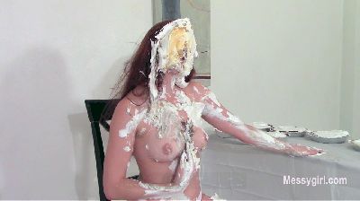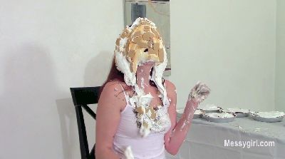Amber is trying to resist the temptation of smashing pies in her face. She holds a pie, but places it back on the table. Then she takes it again and smashes the pie in her face. This sets her off a continuing stream of pies to her face. She never wipes her face, so she blindly reaches for the pies on the table. She becomes aroused and strips nude so she can rub the pie slop on her tits. She even pies her pussy a few times. After she has been creamed with 20 plus pies, she takes a can of whipped cream and sprays it in her mouth. After her mouth is full, she lets the cream ooze out. She finishes herself off by grinding her slippery pussy on the chair. Lucky chair!