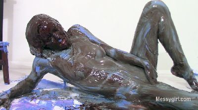 Amber wants to feel the creamy sensation of butter cream all over her body. So we give her a tub filled with pink, blue and purple butter cream. She starts out with her feet and slowly smears it up her body. She then globs it over her face and hair. She has turned into a gooey blue sky colored creature as she rubs it all over her body. Next comes a half gallon of chocolate syrup over her head. The contrast is amazing. She rubs it all over as well. She now has become a dark grey night color. The slippery mixture really turns her on. You get nice views of her sloppy pussy as the slippery mix drips from her plump pussy lips. Very sexy!