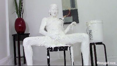 Amy is in a one piece lingerie top as she gets ready to cover herself in Nuru oil. She starts out slowly as she teases the viewers by talking very naughty and showing her tits and pussy. Before you know it she is nude and continues pouring the oil all over herself. She then starts to finger fuck her oiled pussy until she cums. Next she brings out a bucket of white creamy batter to dunk her head in. She pours it over her head and slops around in it on the floor. The mixture become a cum like substance and this turns on Amy. She finger fucks her sloppy pussy again until she cums.