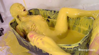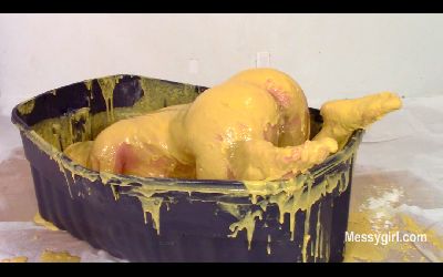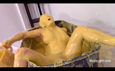 Amy does her very first messy submerging shoot. You will enjoy watching her strip nude and going under the tub filled with thick poundcake batter.