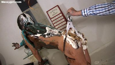 Amber is the first contestant of the Messygirl Extreme Games. She has to draw from a hat that contains pieces of paper with a dollar sign and the letter M for mess. Each dollar sign is worth $25, but if she picks the letter M, she will suffer a messy fate. She starts out well, with two dollar signs in a row, but then the first M is picked, and she gets a pie to the face. She suffers the same fate with various messes, such as beans, tomato soup, custard, flour and even treacle. She is still winning, but getting destroyed at the same time. Then she has to decide if she wants to go double or nothing. She takes on the bet, but loses, and now must suffer a sloppy humiliation. She is now nude and in the ankle stocks, with the force feeder funnel in her mouth. Next comes the slop mixture poured over her head and down her throat. Poor Amber sounds like a backed up sink from all the gurgling noises she makes.