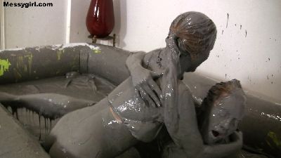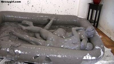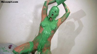 Amy and Penelope are tied back to back and covered in green methylcellulose slime. At fort that are grossed out, but soon the slippery sensation takes over and they become aroused and beg for more. They get their hands free to masturbate themselves and each other, as the slime pours over them. Because the slime is so thick, huge slime bubble emerge from their mouths and noses as they moan in pleasure.