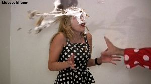 Amy is in charge of the clowns at her dad's circus. She is not too happy about one particular clown, so she confronts him. She is giving him one more chance to prove he belongs at the circus. But Amy is in for a surprise when he tries to convince her by making her the stooge victim. Poor Amy is pied, slimed and even hit in the face with a flour covered pillow. To add to her humiliation, she is stripped topless for more pies and a thick white wash slime. Unable to see, she slips and falls to the floor for more messy humiliation. Then her tone changes as she becomes aroused from being humiliated. She can't help herself, as she strips nude and masturbates.