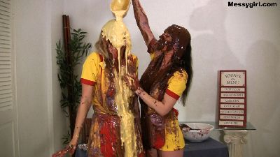 Penelope is selling chocolate dipped fruits and marshmallows and Justine is interested in buying some. But as soon as she samples the fruits, she is not pleased, and lets Penelope know about it. When Penelope has had enough, she takes Justine by the hair and dunks her face in the bowl of chocolate. To add insult to injury, she stuffs Justine's mouth with the fruits and marshmallows. She also strips her nude in the process. When Penelope turns her back, Justine grabs her and dunks her head repeatedly in a bucket of chocolate on the floor. Payback is hell!