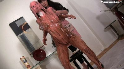 Deni starts out wearing white jeans and a white top. She is pied first and then takes a bucket of hot pink slime over hear head. She is ordered to take off her top and gets more slime. Once totally covered, she takes off her jeans and pulls down her panties for a pie to the ass and gets a wedgie. Deni then goes nude for more pies and a chocolate sliming. Finally she is instructed by Vika to play in the mess on the floor.