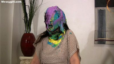 Penelope starts out nude and goes head first in the 5 gallon bucket of sticky fluff. She then starts to coat her sexy body and face until she is an unrecognizable blob. Once covered, she masturbates until she cums.