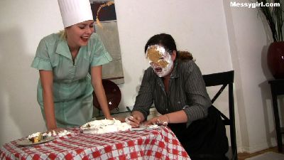 Penelope give Emma her Messygirl initiation. Emma is told to get on her knees as she is destroyed with pies, batter and custard. She also gets her ass spanked with a cat o'nine tails whip.
