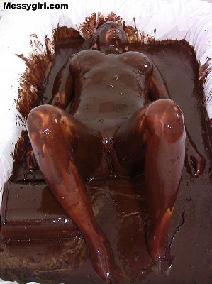 Busty Mai is covered head to toe in dark chocolate. Clothed to nude!