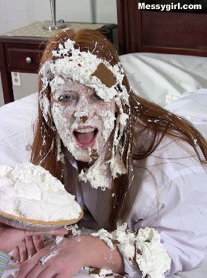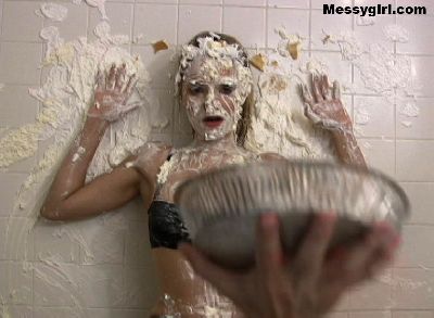 Tracy wakes up Vicky with a pie and then both girls take turns getting each other messy.