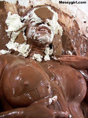 Fae returns and this time she is nude in the shower as she pours chocolate batter over her head. She rubs it all over and then adds a pie to the face.