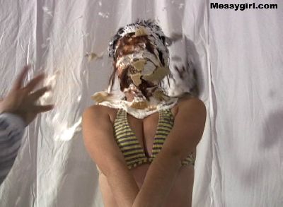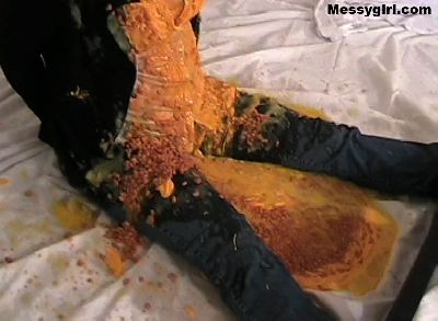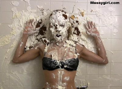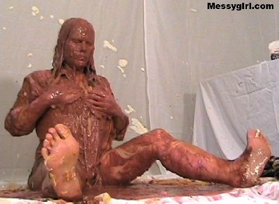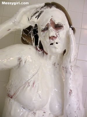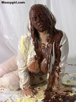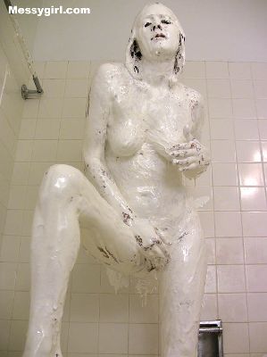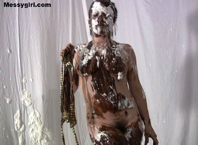 Vicky is in her white satin pajamas as she gets the messygirl treatment. Total coverage!