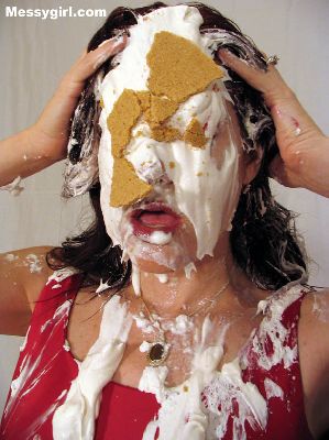Sexy Liz is pied as she is hogtied on the bed. She gets free and covers herself head to toe in the pie slop.