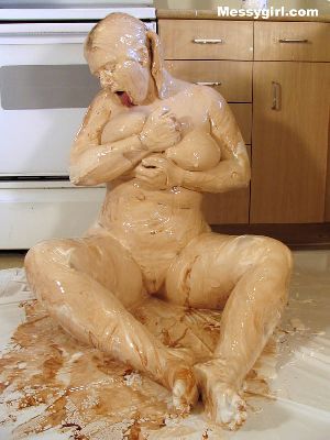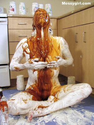 Sexy Michelle is in her body stocking as she covers herself in marshmallow cream, chocolate and caramel syrup! She ends up nude and naughty!